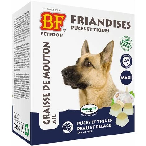 Bonbons BIOFOOD pour faciliter la digestion de votre chien.Aux extraits d’ail et à base de graisse de mouton.Paquet de 40 bonbons. Comment entretenir le transit de votre animal tout en lui faisant plaisir ? Les bonbons BIOFOOD « puces et tiques » facilitent la digestion et aident à éliminer les toxines. Ces bonbons à base de graisse de mouton et aux extraits d’ail agissent afin d’accélérer la digestion et de la rendre plus facile. Ils favorisent également l’assainissement et la purification de l’épiderme, tout en tonifiant et enrendant la peau de votre animal plus résistante. Ces bonbons rendront le pelage de votre animal soyeux, tout en lui donnant de l’énergie. Ils serviront également de protection naturelle contre les parasites. COMPOSITION ET CARACTERISTIQUES : Graisse de mouton (95 %), ail (5 %), Matières grasses brutes 95%, Protéines brutes 1%, Cendres brutes 0,5%, Fibres brutes 1%, Humidité 0,6%, Glucides 1,9%, Vitamine A IE 2000, Vitamine D3 IE <300. Par 1000g, Accélère la digestion pour la rendre plus facile, Stimule l’élimination des toxines, Assainit et purifie l’épiderme, Une peau plus résistante , tonifiée et un pelage soyeux , Apporte énergie et vitalité, Protection naturelle contre les parasites, Pour toutes les races de chiens et tous les âges.