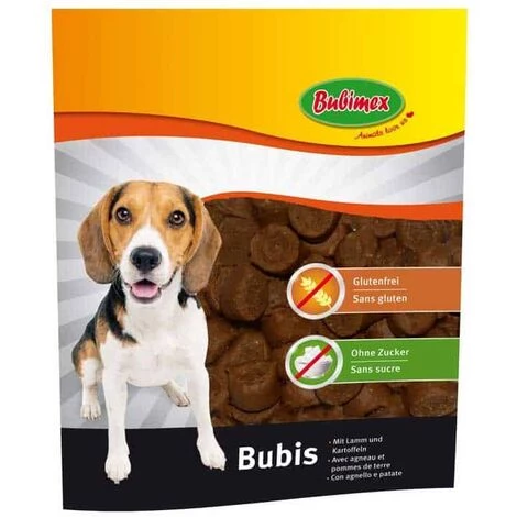 Les BUBIMEX Bubis sont un rĂ©gal irrĂ©sistible pour votre chien. Avec une recette sans sucre, ce produit est idĂ©al pour une collation entre les repas ou en rĂ©compense. Y compris pour les chiens sensibles et allergiques, c’est une dĂ©licieuse friandise. Viande et sous-produits animaux (50 %, dont 4 % d’agneau, pommes de terre, lĂ©gumes, lupins 4 %). protĂ©ines 11,3%, matières grasses brutes 3,1%, cellulose brutes 31,8%, cendres brute 7,2%