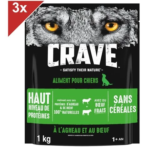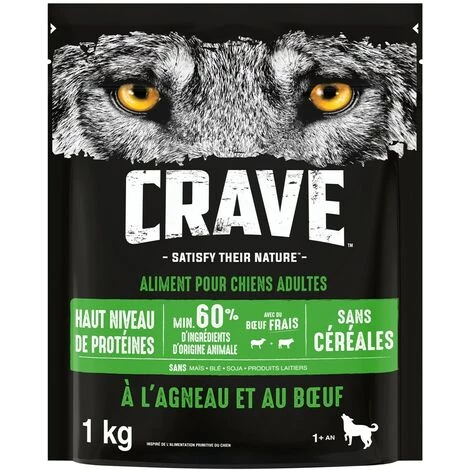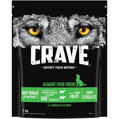 Aliment complet pour chiens adultes (1 an et plus) à l’Agneau et au Boeuf. Les croquettes sans céréales pour chiens CRAVE sont composées avec un minimum de 60% d’ingrédients d’origine animale et avec du boeuf frais, pour participer au maintien de la masse musculaire. Inspirées de l’alimentation primitive du chien, les recettes CRAVE sont préparées avec des protéines animales de haute qualité pour un goût que les chiens adorent.