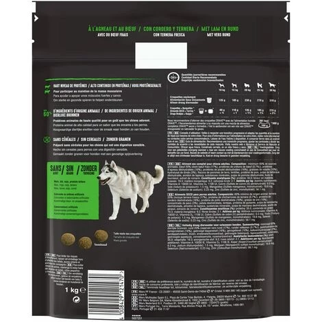 Composition détaillée : Composition: minimum 60% de sources animales: boeuf 20% (dont boeuf frais (17%), protéines de cretons de boeuf (0.7%)), protéines d’agneau déshydratées (16%), protéines de poulet déshydratées (16%), graisses de volaille (10%), hydrolysat de dinde (3%), flocons de pommes de terre, lentilles, protéine de pois, pulpe de betterave déshydratée, amidon de tapioca, substances minérales, pulpe de pomme déshydratée, huile de tournesol, extrait de romarin.