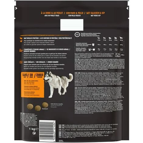 Aliment complet pour chiens adultes (1 an et plus) – à la Dinde et au Poulet. Les croquettes sans céréales pour chiens CRAVE sont composées avec un minimum de 60% d’ingrédients d’origine animale et avec du poulet frais, pour participer au maintien de la masse musculaire. Inspirées de l’alimentation primitive du chien, les recettes CRAVE sont préparées avec des protéines animales de haute qualité pour un goût que les chiens adorent.
