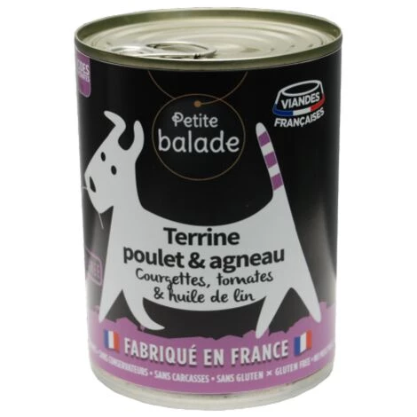 Notre compositionCette terrine se compose également de courgettes et de tomates pour une recette originale et savoureuse qui comblera votre chien. Riche en vitamines et minéraux, cette formule a été élaborée avec des vétérinaires pour répondre au mieux aux besoins canins et contribuer à la bonne santé de votre animal de compagnie.Cette terrine de poulet et agneau convient à tous les chiens, y compris les plus sensibles, grâce à des ingrédients de qualité sans céréales, ni viandes déshydratées. Un produit humide haut de gamme qui peut aussi bien compléter l’alimentation quotidienne de votre chien ou la remplacer complètement.Composition :Poulet 40%, agneau 20%, courgettes 5%, tomates 5%, minéraux, huile de lin 0,2%.Servir tel quel à température ambiante. Après ouverture, se conserve 24 heures au réfrigérateur.Constituants analytiques:Protéine brute : 10.5%Matières grasses brutes : 4,5%Cendres brutes : 2%Cellulose brute : 0,3%Humidité : 81%Taux de glucides : <3%Additifs (par kg) :Additifs nutritionnels : vitamine A : 1900 UI, vitamine D3 : 280 UI, vitamine E : 22mg – Fer : 12 mg (sulfate de fer heptahydraté) – Zinc : 24 mg (sulfate de zinc) – Manganèse : 1,6 mg (sulfate manganeux) – Cuivre : 2,2 mg (sulfate de cuivre pentahydraté) – Iode : 0,47 mg (iodure de potassium) – Sélénium : 0,03 mg (selenite de sodium) sans viandes déshydratées ? sans céréales ? sans colorant ? sans conservateurs ? sans carcasses ? sans glutenFabriqué en France, viandes française