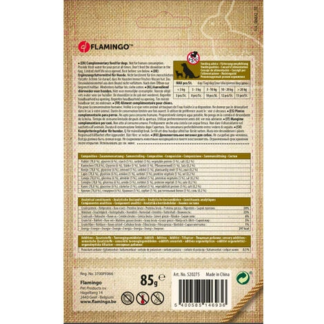 - composition: Lapin (78,8 %), glycérine (6 %), amidon (5 %), sorbitol (5 %), protéine végétale (5 %), sel (0,2 %)