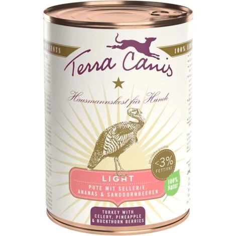 TERRA CANIS LIGHT DINDE 400G – Dinde au cèleri, Ă l’ananas et Ă l’argousier. Coeur de dinde (42 %), carotte, cĂ©leri (11 %), brocoli, foie de dinde (8 %), panais, ananas (4 %), farine de noix de coco, farine de graines de potiron, graine de psyllium, huile de pĂ©pins de raisin, huile de lin, levure de bière, algue marine (0,4 %), baie d’argousier (0,3 %), feuille d’artichaut (0,3 %), poudre de coquille d’oeuf, basilic, pissenlit, argile