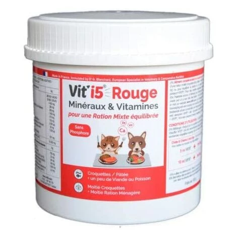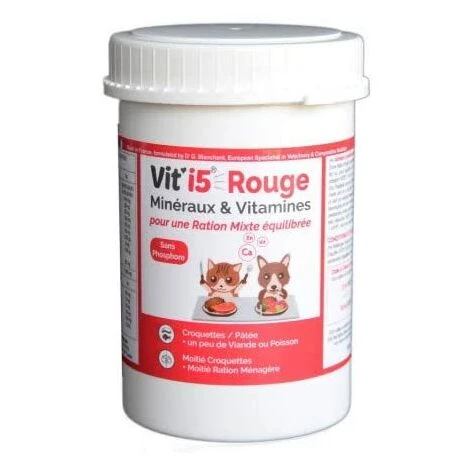 Vit’I5 Rouge pour Chien et Chat est un complĂ©ment alimentaire pour une ration mixte Ă©quilibrĂ©e pour votre animal de compagnie.