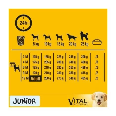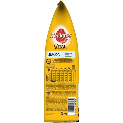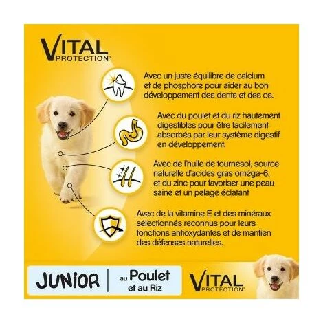 Aliment complet pour chiens juniors – Au Poulet et au Riz. Les croquettes Pedigree Junior offrent à votre chiot un repas 100% complet et équilibré, adapté à sa taille et à son âge, avec des ingrédients naturels et sans arôme artificiel ajouté.