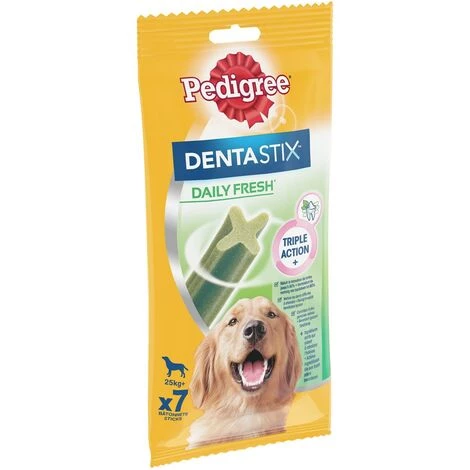 Les bâtonnets à mâcher Pedigree® Dentastix Fresh vous aident à garder les dents de votre chien saines, des gencives fortes et à rafraîchir l’haleine. Technologie de bâtonnet unique brevetée. En utilisation quotidienne, ce stick dentaire en forme de X unique aide à réduire jusqu’à 80% la formation de tartre. Avec une texture légèrement abrasive conçue pour permettre un frottement sur les dents et des ingrédients actifs qui agissent directement sur la salive qui aide à réduire la formation du tartre. Ces bâtonnets nettoient les dents difficiles à atteindre et contribuent à des gencives saines. De plus, ils contiennent un complexe spécifique d’extrait de thé vert et d’huile d’eucalyptus, reconnus pour favoriser une haleine fraîche.