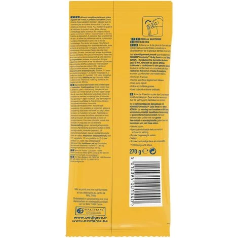 4 chiens sur 5 de plus de 3 ans ont des problèmes bucco-dentaires. Ils sont causés par le développement de la plaque dentaire et du tartre. Une bonne hygiène bucco-dentaire représente le meilleur moyen de les réduire. 77% des vétérinaires reconnaissent les sticks dentaire comme un bon outil en hygiène bucco-dentaire. Il est scientifiquement prouvé que les bâtonnets à mâcher Pedigree® Dentastix vous aident à garder les dents et les gencives de votre chien en bonne santé. Les friandises pour chien Pedigree® Dentastix sont disponibles en différentes tailles (chiot de plus de 4 mois/petit, moyen et grand) pour s’adapter à tous les chiens. Friandise pour chien mise au point avec nos nutritionnistes et nos vétérinaires du centre de recherche WALTHAM® – Principale référence mondiale pour la nutrition et le bien-être des animaux de compagnie.