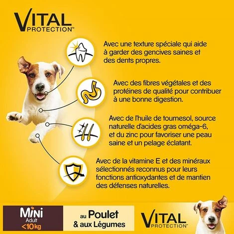 Les besoins nutritionnels des chiens varient en fonction de l’âge et de la race. C’est pourquoi il est important de leur donner une alimentation spécifique à leurs besoins. Développées avec nos nutritionnistes et nos vétérinaires du Centre de WALTHAM, les croquettes Pedigree Vital Protection sont élaborées pour couvrir nutritionnellement quatre besoins universels du chien; une alimentation pour chien qui aide à maintenir les défenses naturelles, favorise une peau et un pelage sains, contribue à une digestion optimale et à nettoyer ses dents.