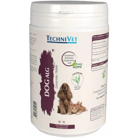 Les aliments complémentaires Dog Alg est un produit naturel marin pour chien ou chat.Il permettra à votre animal d’éliminer plus facilement les toxines tout en aidant à la repigmentation de sa truffe.Boite de 750 comprimés – 750 g Aliments complémentaires Dog Alg pour chiens et chats. Produit naturel marin riche en oligo-éléments, vitamines et sels minéraux. (Elements actifs : 35 acides aminés) Active le métabolisme général , stimule l’élimination des toxines, assure à l’animal vitalité et résistance Aide à la repigmentation de la truffe. Boite de 750 comprimés (750g). Bien suivre la posologie en fonction du poids de l’animal Existe aussi en poudre Composition : Seaweed meal, yeast, maltodextrin Additives : None