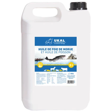 L’huile de morue apporte aux animaux des acides gras essentiels (polyinsaturés) : Oméga 3 et 6, des vitamines et de l’énergie. Capacité : 5 L Objectifs . Préparation à l’oestrus et à la reproduction. . Maintien le bon fonctionnement du système immunitaire. . Maintien la bonne santé de l’épiderme. Composition 50% huile de foie de morue, 50% huile de poisson. L’huile de foie de morue Wintérisée et vitaminée est obtenue à partir du foie frais de morue, riche en vitamines naturelles A, D3 et additivée en vitamines A, D3, E : E672 Vitamine A : 500 000 UI / kg E671 Vitamine D3 : 50 000 UI / kg E307 Vitamine E : 100 UI / kg La Wintérisation rend l’huile plus appétente et mieux assimilable par l’animal. Constituants analytiques . Matières grasses brutes : 99% . Protéines brutes/cendres brutes/cellulose/sodium/ lysine/méthionine : absence. L’utilisation de cet aliment doit être enregistré sur un registre d’élevage. Mode d’emploi Dose journalière par animal en grammes à distribuer avec l’aliment( granulés , ensilage) ou dans l’eau de boisson : . Truies et verrats : 30-50 g . Porcelets : 5-15 g . Porcs à l’engrais : 20-40 g . Bovins adultes : 60-100 g . Jeunes bovins : 30-50 g . Bovins à l’engrais : 50-70 g Mode d’emploi spécifique . Truies en gestation : 60 g/truie/jour, 6 jours avant sevrage + 12 jours après ou 60 g/truie/jour, 6 jours du 12ème au 18ème jour de gestation. . Porcelets : 30 g/portée/jour sur l’aliment. . Vaches laitières : 100 g/VL/jour, 8 jours par mois. Autres informations L’huile de poisson utilisée est sélectionnée pour sa teneur élevée en Oméga 3. Avant utilisation ou prolongation de la période d’utilisation, il est recommandé de demander l’avis d’un expert en nutrition animale ou d’un vétérinaire. Veiller au cumul des apports d’additifs afin de ne pas dépasser les doses maximales règlementaires. Existe également en bouteille d’1 L.
